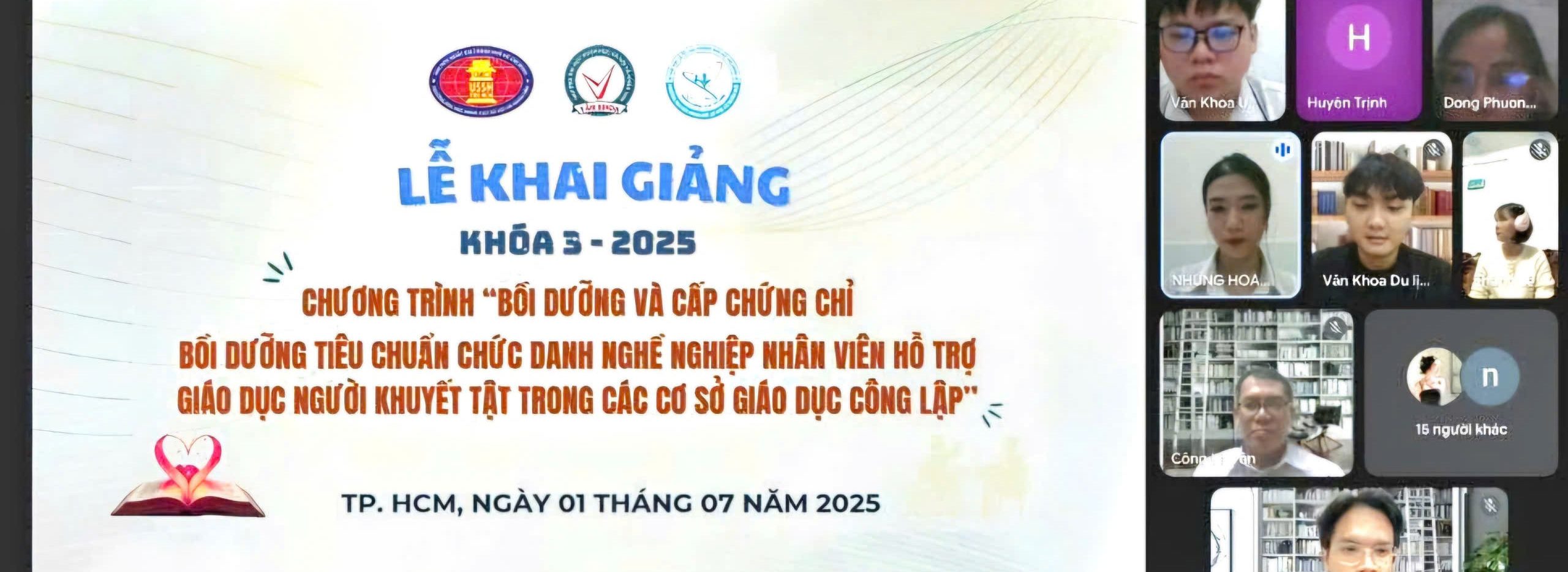 Công ty TNHH Dịch vụ Khoa học và Du lịch Văn Khoa trân trọng thông báo về Lễ khai giảng chương trình Bồi dưỡng tiêu chuẩn chức danh nghề nghiệp Nhân viên hỗ trợ giáo dục người khuyết tật trong các cơ sở giáo dục công lậpKhóa 3 năm 2025, được tổ chức vào lúc 18h00 ngày 01/7/2025, theo hình thức học trực tuyến.