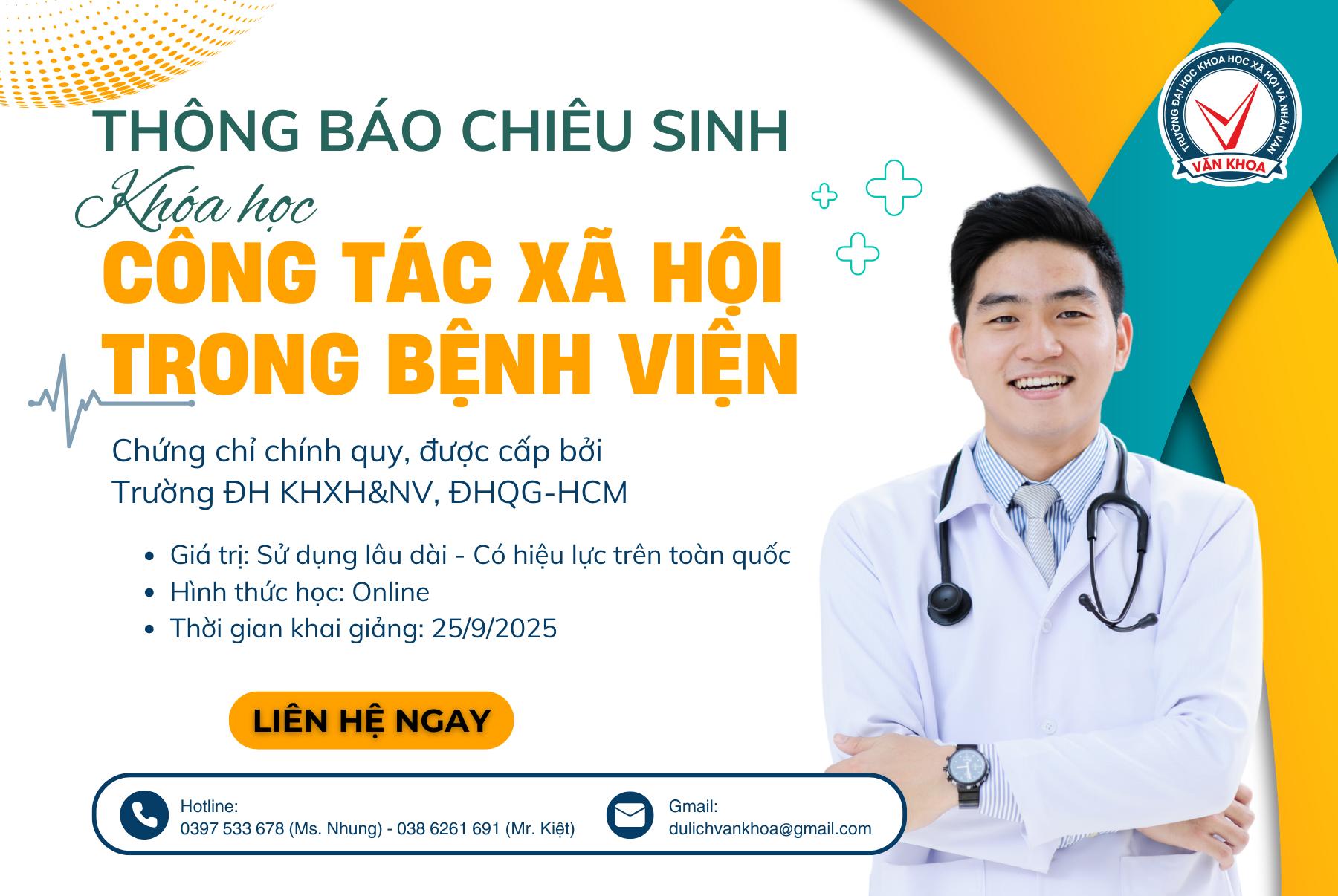 Nhằm đáp ứng nhu cầu này, Văn Khoa USSH phối hợp cùng Trường Đại học Khoa học Xã hội và Nhân văn – ĐHQG TP.HCM tổ chức Khóa 19 – Chương trình “Nghiệp vụ Công tác xã hội trong bệnh viện”. Đây là khóa học chuyên sâu giúp học viên trang bị kiến thức, kỹ năng và chứng chỉ giá trị trên toàn quốc, mở ra cơ hội phát triển nghề nghiệp bền vững trong lĩnh vực công tác xã hội y tế.